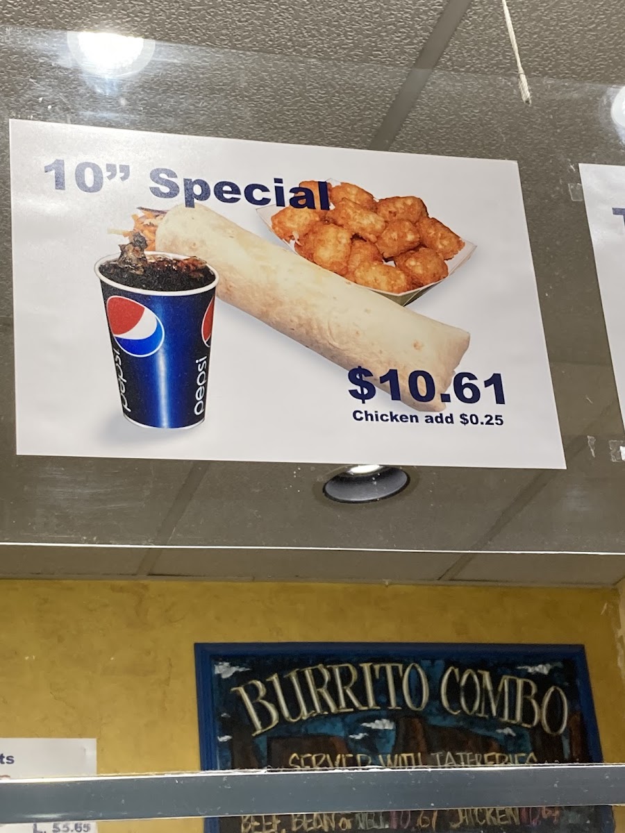 Been wanting to try this place out for a while. Glad I finally found time to visit, and I'm not disappointed at all. Ordered the Super 10 (chicken), and the 12' soft burrito (beef) combo. The ingredients in the soft burrito were nice and fresh. The tater tots were really well done. Light and crispy on the outside, soft and fluffy on the inside. The crispy chicken burritos were good by itself; it had a sweet aftertaste. Plus, I recommend you dip your tater tots with the salsa they give you. The service was fast too. Came here around 2:30pm on a holiday (Remembrance Day). Ordered and everything was ready within 10 minutes. I'll definitely be back if I'm ever at this food court. Very well done. Highly recommend if you want your Tex Mex fix.