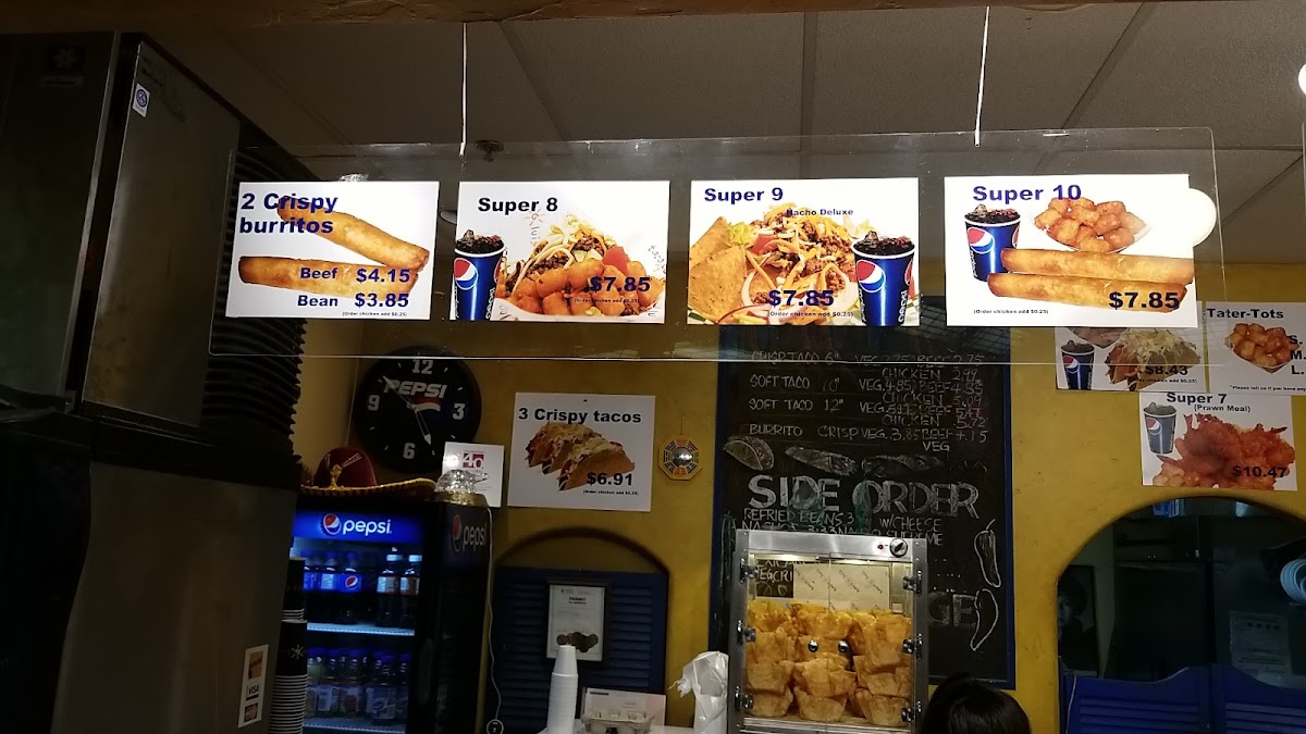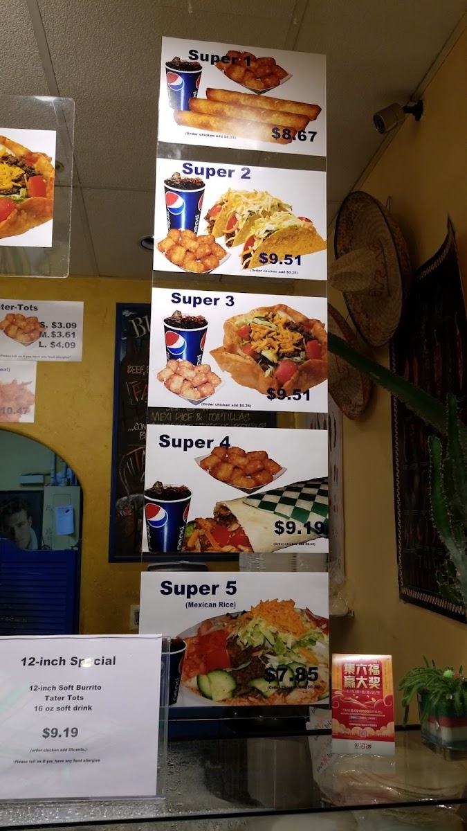 I was very curious to try this place as it's the only Mexican place in a very Asian mall. I got the Super 2 (tacos) and 4 (burrito). It gets the job done if you have cravings for Mexican food. Both items I got were ground beef. It was surprisingly sweet, which I am not used to. I'm not a fan of the salsa as it's also sweet. Tater tots were random but it was really good. I ate all of the tots before I got home. I wished I saved some and ate it with my burrito. :) I got my order very fast and it was ready in just a few minutes. The staff were nice and made sure my order was right. Honestly, I'd rather come here than Chipotle down the block. I can't wait for my next craving for Mexican food.